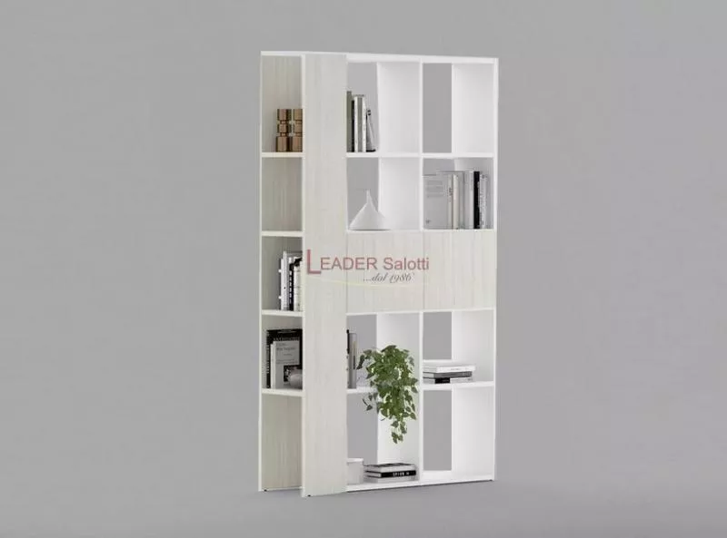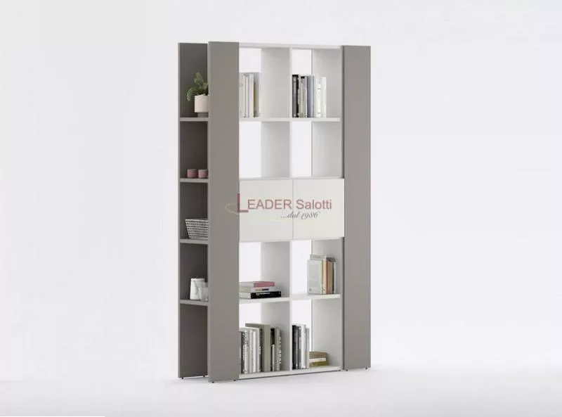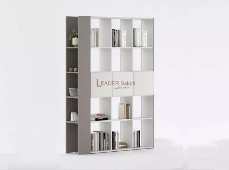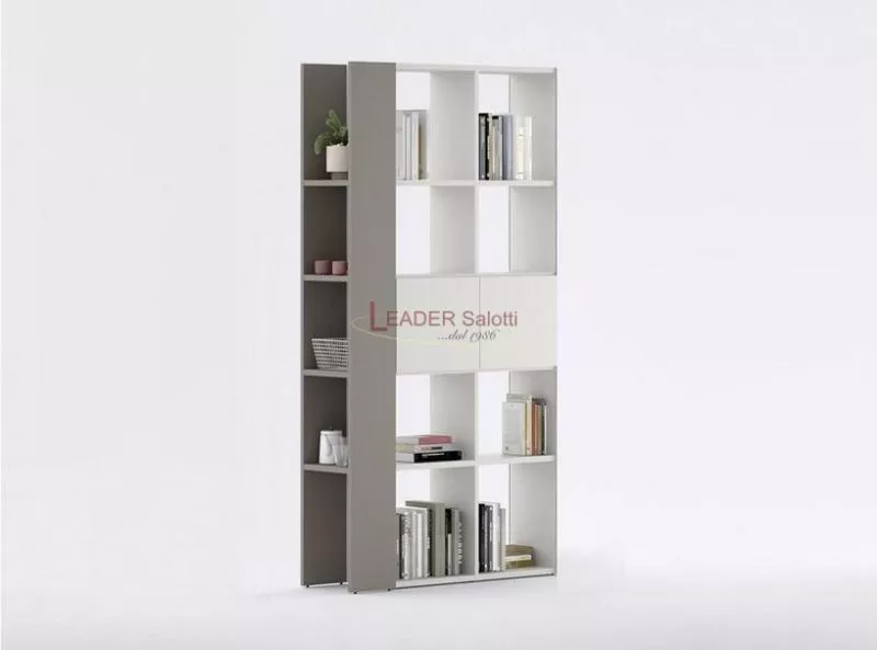 Libreria passante bifacciale con terminali aperti lateralmente e provvisti di ripiani, perfetta per dividere ambienti