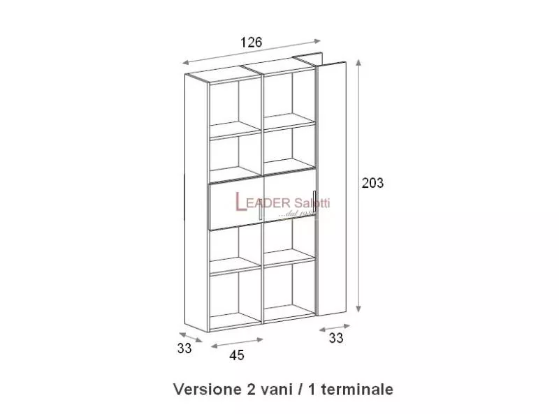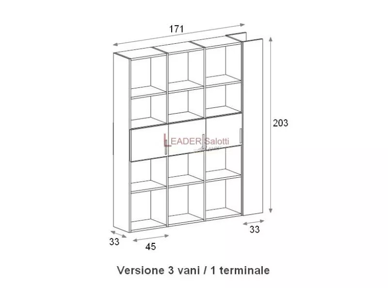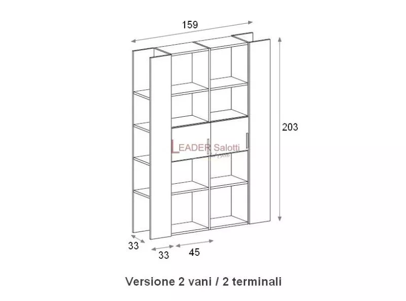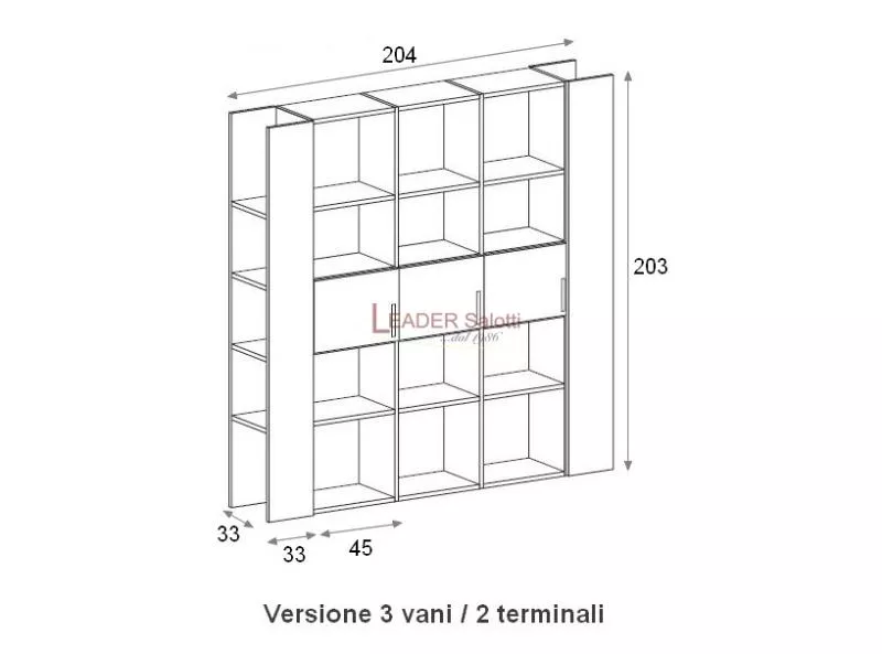 Il prezzo base corrisponde alla versione con 3 moduli da 45 cm + 2 terminali da 33 cm. Misura totale: L 204 x P 33 x H 203 cm. Configura il modello che preferisci.