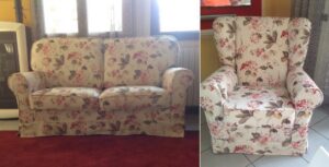 Nuovo rivestimento poltrona Bergere e divano due posti in tessuto cretonne. Rif. Fiorella M.